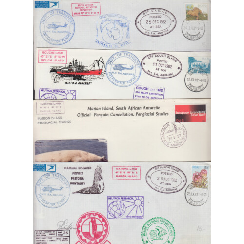 1980's Twenty-one government covers posted off shore in various world locations. Includes 1982 posted at sea from the MV SA Agulhas at Gough Island, 1980 South African National Antarctic Expedition, 1978 Department of Weather Office South Atlantic and 1983 Emergency Causality Evacuation from Marion Island. Very interesting collection.