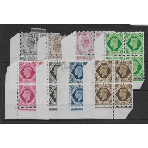 1937-47 Group of nice bottom left corner marginal blocks of 4, typically two stamps hinged, two are unmounted mint for 4d, 5d, 6d, 7d, 8d, 9d, 10d & 1s values, some pencil marks in margin otherwise nice blocks of 4. SG 468/474, 475. (8 blocks). Cat £160+.