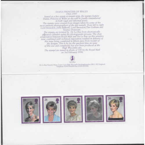 1998 De La Rue printed presentation cards for 5 different Commem sets (includes Diana strip of 5, scarce in this format) each affixed to the card by neat hinges with a nice printed write up about the production of each set and stamp, these were issued by De La Rue who printed these folded cards as pre-issue publicity or presentation purposes so small numbers were prepared and distributed, ex John Harley Harrisons archivist. Useful opportunity. (5 diff).