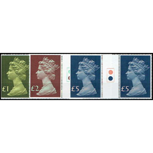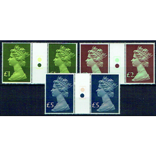 1977 Set of three high values £1, £2 & £5 each in traffic light gutter pairs unmounted mint, fine.