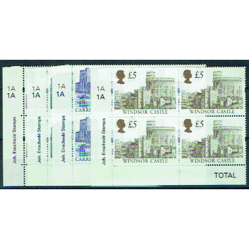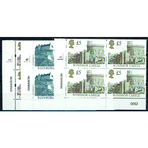 1997 Enschede Castle High values in plate 1A bottom left cylinder blocks of 4 unmounted mint plus 1992 Harrison £2 4F Cylinder block of 4, SG 1613, 1993/1996, face £46, cat £320.