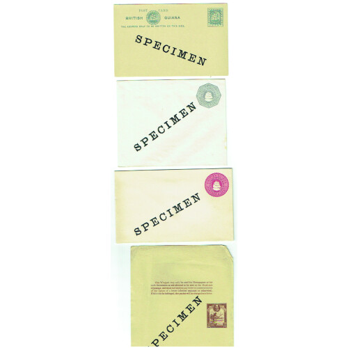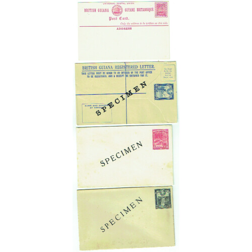 SPECIMEN Overprints on twelve postal stationery cards and envelopes. Includes Ship 1c grey & 2c red single cards, 2c red reply card, 3c with perfinned Specimen diagonally across the stamp, embossed envelopes octagonal design 1c green, 2c red, 5c grey, GV 2c brown newspaper wrapper, 3c Gold Mining env, GVI1c green pictorial card, 2c waterfall env (tones), 6c blue registered P/S env each with SPECIMEN diagonally across the centre in black. Nice group of 12 Specimen items.