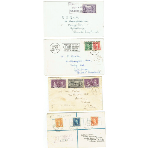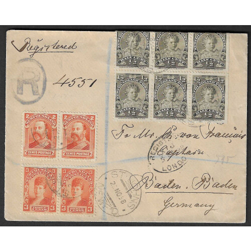 Newfoundland: 1898 Registered cover St John's to Germany with attractive combination 1897 defins ½c olive folded over blk of 6, 2c orange pair, 3c orange pair, (SG 83, 86-7) tied CDS cancels, via London transit and onto Baden in Germany. Arrival backstamp. Fine. SG cat £31 x 10 on commercial cover. (£310).