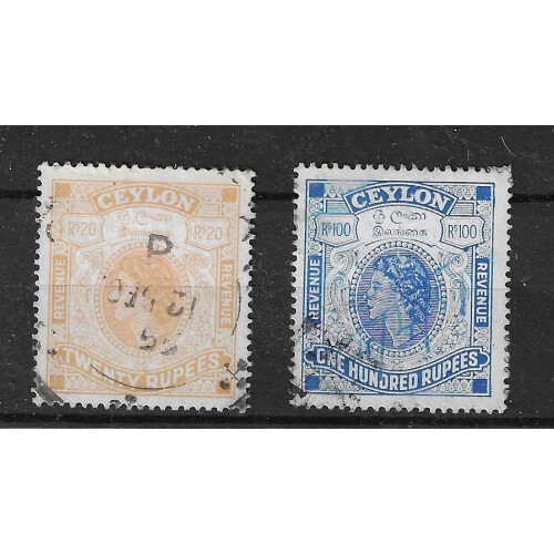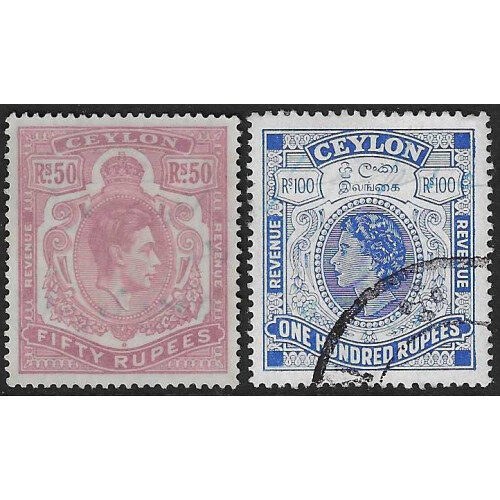 Revenue: 1938-1984 useful group of high values used including 1938 GVI 10r & 20r, 50r mauve and purple, 1954 QEII 20r orange, 50r brown (pin hole), 100r blue, then few later to 100r brown or dark red. Nice group. (11). Barefoot 8/10, 16/18, 29 & 33.