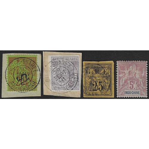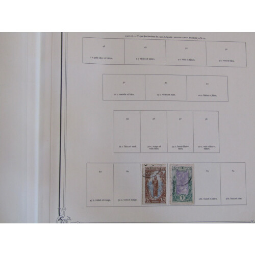 OLD TIME Printed Yvert album with a useful mint and used collection in country sections emphasis on 19th century to early 20th century better throughout noted Ivory Coast 1892 to 1f (Cat £280), 1900 15c, 25c mint, 50c used, 1912 surch set m, 1913 River Scene set mint, FR. Somali Coast 1894 imperfs to 30c m & u, 50c h/s specimen, 1902 0.05 on 75c orange & mauve f.u. (Cat £60), 10c on 10f mint (Cat £49), 1902-03 long set complete minus 2f mainly mint (Cat £300), 1903 centres in black mostly mint (Cat £225), 5f yellow-buff CDS (Cat £65), 1909 almost complete incl 1f & 2f used (Cat £115), 1915 set mint (Cat £65), Dahomey 1899-1905 to 50c m & u, 1906-07 to 1f used, 1906 P.Due to 1fr mint, 1912 surcharges , Indo-Chinese P.O. in China Kwangchow 1906 to 1f mint (Cat £140), 1923 set 21 mint (Cat £70), Madagascar 1891 5c, 15c & 25c used (Cat £110), 1895 ovpt 5c mint, 15c to 5f used (Cat £390), 1896-99 set mainly mint (Cat £200), 1900-06 25c mint, 35c used, 1902 surcharges 8 values m & u incl round Zero type II 0.05 on 30c mint, 1903 Zebu and Lemur 14 vals to 75c mint, 5f mint (Cat £400), 1908 Transport long set m (Cat £55), P.Dues 1896 40c mauve mint, Morocco 1891-1900 to 1p on 1f used (Cat £260), 1902-10 1p on 1f used (Cat £70), 1911-17 mainly complete mint, 1917 to 2p (2p is unused cat £190), P.Dues etc. Useful lot for expansion.