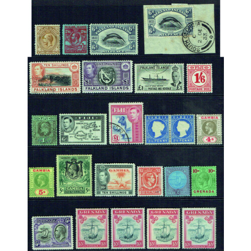 British Commonwealth useful mint and used collection for QV to GVI periods for countries Falkland Is. to Grenada, many better pickings and sets noted Falkland Is. QV ½d green (5), 2d (2), 4d, GV 2d, 2½d, 6d & 1s mint, 1929 Whale & Penguin to 2/6 m & u, GV War Stamp, 1933 Centenary set to 6d mint (Cat £190), 6d used on paper by SOUTH GEORGIA 2 DEC 33 CDS (toning, cat £95), 1938 vals to 5s & 10s CDS used (Cat £150), mint range incl 2/6 slate , 5s, 10s & £1 (Cat £465), 1952 to 10s mint, to £1 used, Falkland Is. Deps 1944 sets both mint & used (Cat £132), Fiji P.Dues 1940 set mint (Cat £140), EDVII to 1s mint, GV to 2s mint, 1938 to 5s mint (diff printings, STC £330), set to £1 used, Gambia GV 3s, 4s & 5s mint (Cat £195), 1922-29 Elephant defins 2s, 2/6 & 5s mint (Cat £100), 1938 set mint (Cat £170), Gibraltar to £1 mint, to 10s used, Gilbert & Ellice 1911 set 4 both m & u (Cat £73), 1939 set to 5s mint (Cat £50), Grenada 1908 2s mint, 1921-22 GV to 10s mint (Cat £150), 1934 set 10 mint (Cat £60), 1938 good range of different printings mint incl 5s (4), 10s (4) used to 10s (2), etc, very useful collection STC £6800+. Approx 600+.