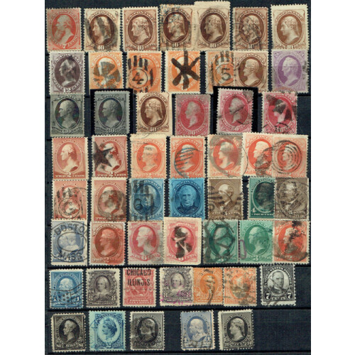 1870-79 Classics assembly on stockpage with useful assembly incl values to 90c (3) for different printings, 30c black unused, 24c purple, 15c orange (4), 12c dull violet, plus a few fancy cancels on low values, very mixed condition, high Scott retail. (53).