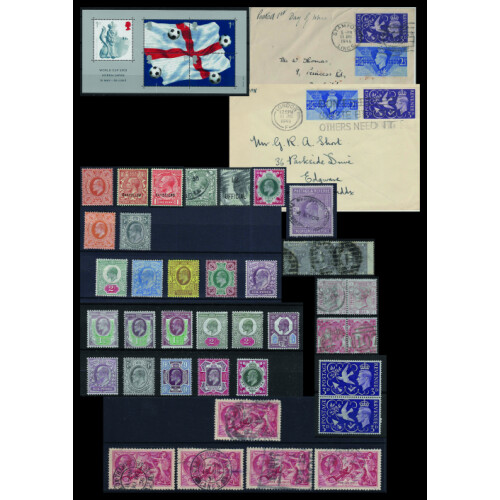 1841-1968 Nice original collection in Simplex springback a little jumbled from QV to QEII mint and used value in the earlier incl 1841 1d imperfs, 1884 lilac and greens to 1s (varying condition), 1858-79 run of 1d plates 71 to 224 mainly complete fine used, 1856 1d stars blk of 4, few cancels on line engraved incl Guernsey, Surface Printed incl 1862-1880 4d red / vermilion (11), 8d orange used, 1883 6d on 6d f.u., 1880 2½d rosy-mauve plates 1-17 used, 2½d ultramarine pl.17-23, 4d sage-green 15 & 16, 3d rose plates 4-21, 1s green plates 1-, 4-13, 1856 4d rose (2), 1s orange-brown pl.13 & 14, 1856 1s used 223 cancel, 1865 9d straw used straight edge, 1867 10d red-brown heavy used, 1862 9d bistre heavy used (dark shade), 6d grey plates 12-18, 4d grey-brown pl.17 & 18, 1887 to both 1s mint (or unused), Telegraphs QV 5s used, EDVII to 10d mint, GV 1924/5 Wembley sets mint, GV Seahorses to 10s, GV/GVI watermark varieties used, 1937 Coronation identified flaws used (11 diff), over 1500+ stamps, huge catalogue value. Nice original lot.
