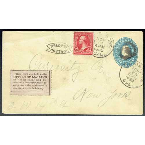 1890 HELD FOR POSTAGE - 1c blue postal stationery envelope uprated with 2c red Washington from SANTA ROSA (California) to NEW York, underpaid with HELD FOR POSTAGE h/s alongside and perforated label on black on rose affixed,"This letter was held at the OFFICE OF MAILING as 'short paid', and forwarded afterwards, upon receipt from the addressee of stamp to cover deficiency. Small faults, fine strike. With manuscript Rec Unsealed / M- PO on reverse alongwith C / N.Y. cds backstamp.
