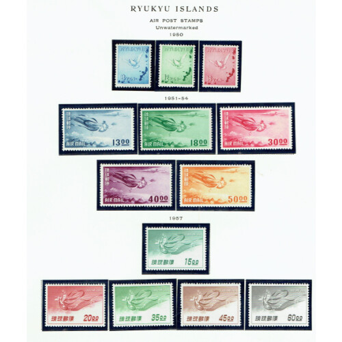 Ryukyu Islands: Airmails Mainly unmounted mint collection of sets and ranges on Scott printed leaves includes 1950 set 3 (Scott $167), 1951-4 set, 1957 set (Scott $67), 1959 surch set, 1960 surcharge set, others to 1963. (30).