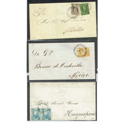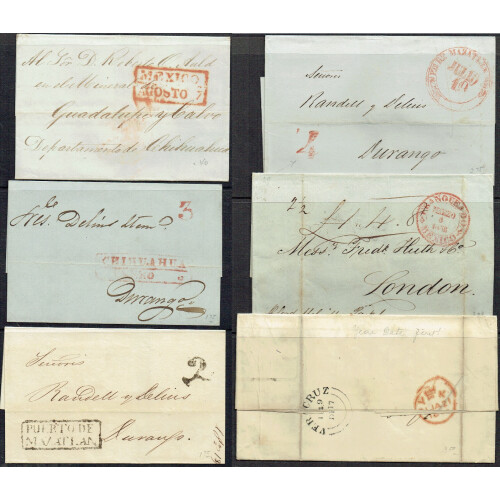 Pre-Stamp Wrappers and entire letters mainly a correspondence to Durango for 1840s to 1860s includes many nice town handstamps single and two line in red or black, paid marks incl 2 h/s in red or black, noted FRANCO / EN NAZAS, PAPAQUIARO, 1846 MEXICO / DICIEMBRE 12 boxed in red with 5 charge in red to Durango, ZACATEGAS / MARKO 6, CERREGORDO, CHIHUAHUA 3, PUERTO DE / MAZATLAN (2 double line plus one red circular 1845 undated cancel), GUANAJUA 3, GUAD Y CALVO, DURANGO / JUNIO 23 7 chargemark, PARRAL, SAN LUIS POTOSI / MAYO 21, SOMEBRERETE, 1838 FRANQUEADO CDS in red to London, VERA CRUZ dated arc in black 1842 & 1847 to London. Mainly fine, 20 items, nice collection of these attractive covers.