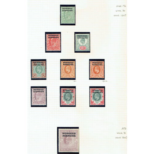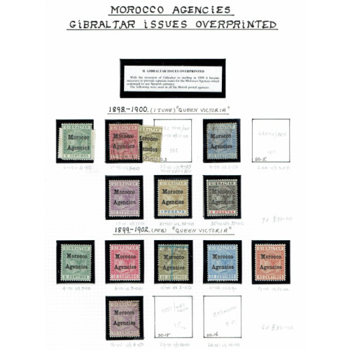 Useful collection QV to 1957 with better throughout on large leaves, noted 1898-1900 QV ovptd 50c, 1p & 2p mint (Cat £75), 1899 to 50c m & u (Cat £70), 1905 EDVII 50c, 1p & 2p mint (Cat £95), 1925 set to 1s mint (Cat £55), 1907 to 1s mint, 1949 set 17 (Cat £85), 1935-37 2/6 & 5s mint (Cat £90), 1951 set 7 mint (Cat £38), Spanish Currency; 1907-12 to 6p on 5s mint (Cat £80), two nice combination pieces used, French Currency to 6p on 5s mint, 1948 RSW set m, Tangier 1948 RSW set m, 1949 set, 1950 set mint, 1955 QEII Castles mint, 1957 set to 10s mint, mainly fine, good cat value (STC £1900). Nice collection ideal for expansion. (Approx 420).