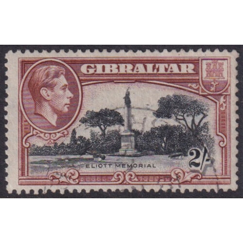 1938-51: 2s. black & brown, wmk. Multiple Script CA, a used example showing scarce variety: "Bird on the Memorial" (Row 9, stamp 3), lightly cancelled leaving the variety clear. Corner perf. crease otherwise scarce SG Cat £500. Lovely example.