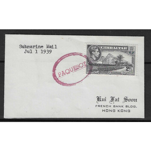 1939 (1 July) Small cover with printed address to Hong Kong bearing 2d grey defin tied oval PAQUEBOT cancel in red with typed Submarine Mail . Jul 1 1939 in top left corner, unusual.