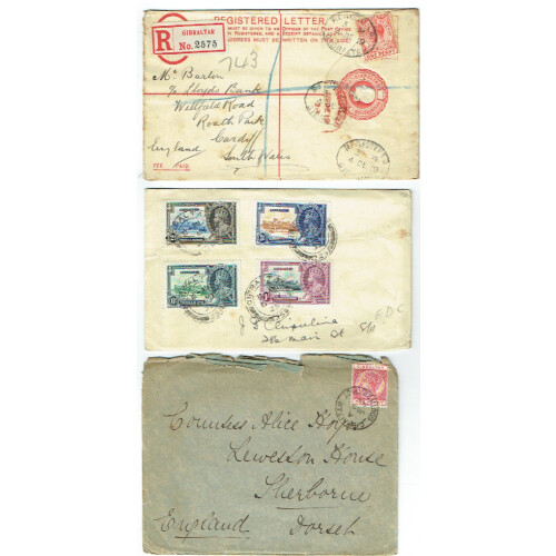 Three covers QV-GV including 1899 1d red on tatty cover to UK tied GIBRALTAR SOUTH DISTRICT A CDS, 1935 Silver Jubilee set four on First Day Cover with horiz. crease, 1919 2d red GV registered postal stationery envelope to UK uprated with 1d red both tied REGISTERED oval cancels, (tones). Useful trio.
