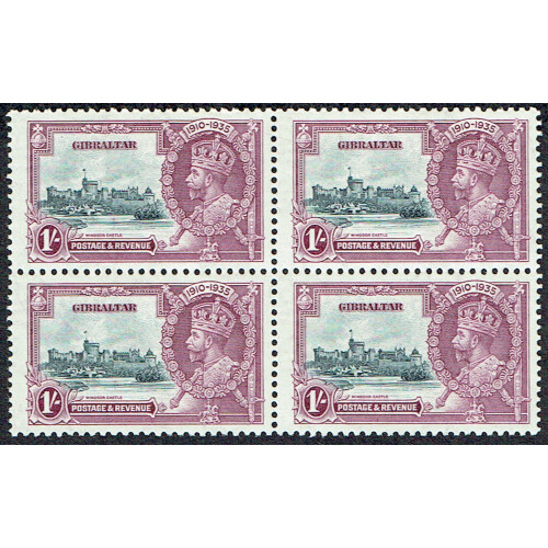 1935 Silver Jubilee 1s in block of four unmounted / mounted mint showing extra flagstaff variety on top left stamp (U/M), SG 117a.