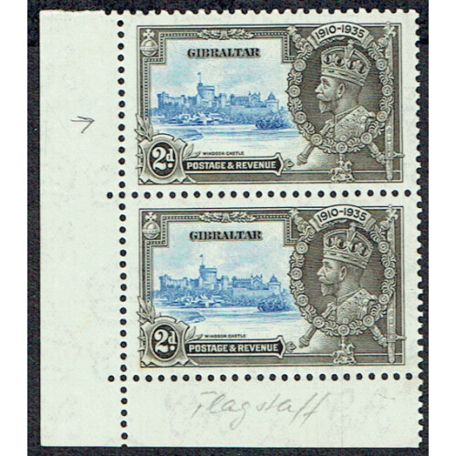1935 Silver Jubilee 2d in bottom left corner marginal vertical pair unmounted mint showing extra flagstaff variety on top stamp SG 114a.