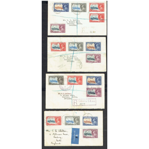 1935 Silver Jubilee Commercial covers (10) mainly registered with full sets incl Dominica, Grenada, Turks & Caicos, Falkland Is., Cayman Is., St Vincent, Leeward Is., Gilbert & Ellice Is., St Christopher & Nevis, Virgin Is., mixed condition.