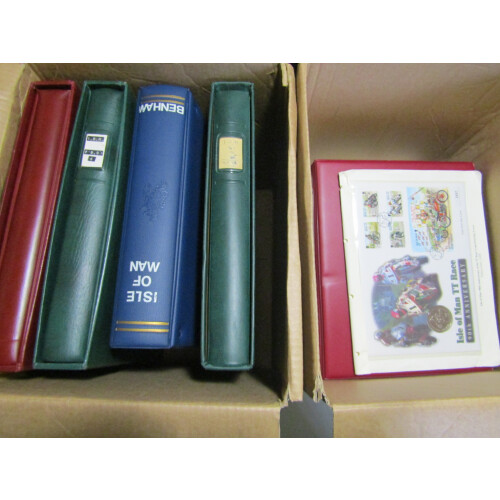 Two cartons containing various albums and binders including 1970s-90s U/M sets in printed album, large binder full of tram tickets, FDCs loose in bundles, registered postal stationery envelopes unused for different sizes, Ramsay FDC and special event covers, 1996 TT Races Coin cover etc, heavy lot.
