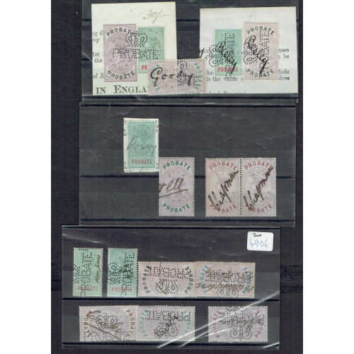 Great Britain: QV Probate group of 24 including multi combinations off documents to make high face values including £6 pair, £5, £2, £1, etc all perfinned Crown over PROBATE, plus combination £6 pair + £5 pair + 10s & 5s. Mainly fine for these. (24).