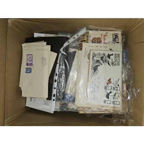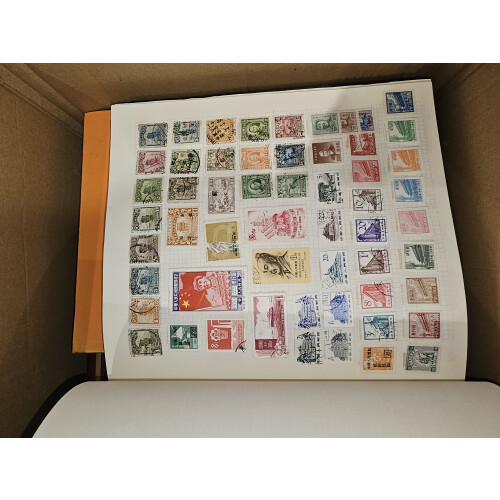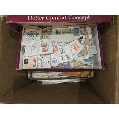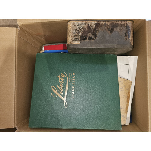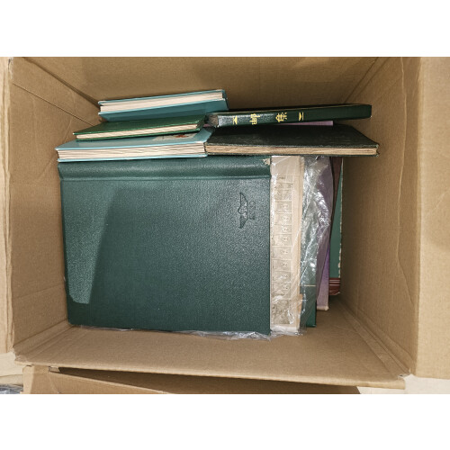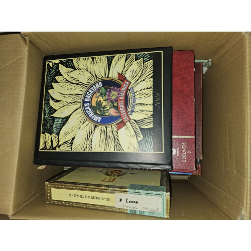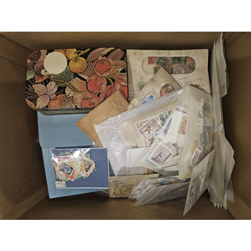 BOX containing a worldwide accumulation from a huge estate lot unsorted and unpicked as received (a van full) typically includes albums, folders, on leaves, stockbooks, noted USA 19th century plus some nice revenues $2+, Italy folder from 19th century to modern, Japan, Italian colonies, too much to list, a good genuine sorter lot offered intact, plenty to go at here, 1000s?