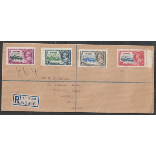 1935 (29 Jul) Regd cover to UK bearing 1935 Silver Jubilee set of 4 tied nice cds cancels with regd etiquette No. 0346.