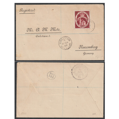 1899 (24 Mar) 5s lake on a superb printed registered cover to Nuremberg Germany tied single KINGSTOWN / A/ /MR 24 / 99 cds cancel, superb and seldom seen so nice, SG 53.