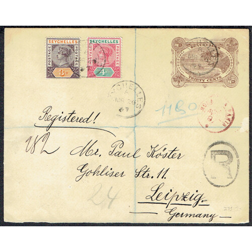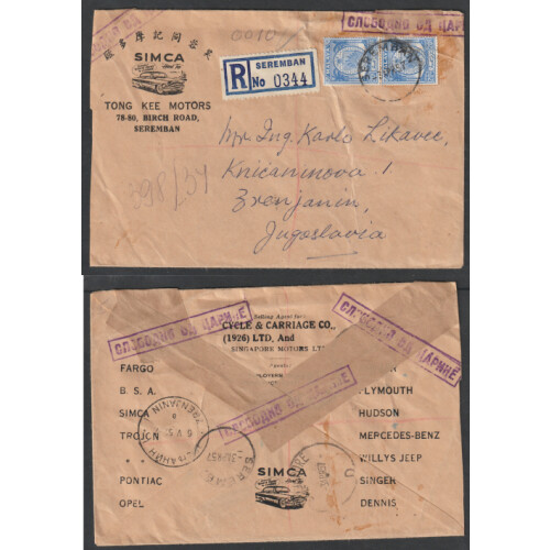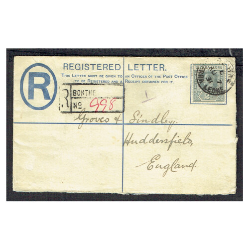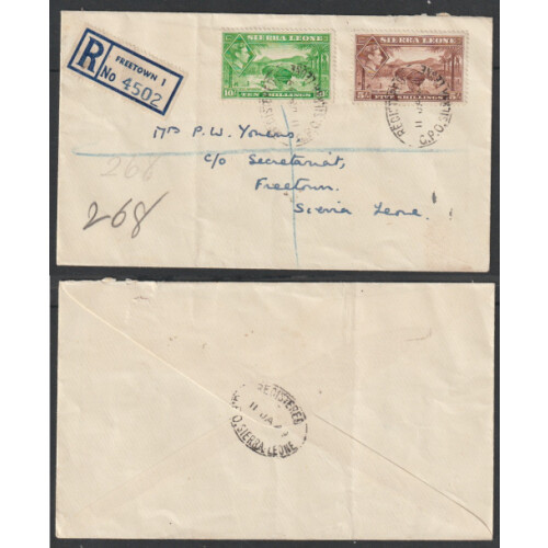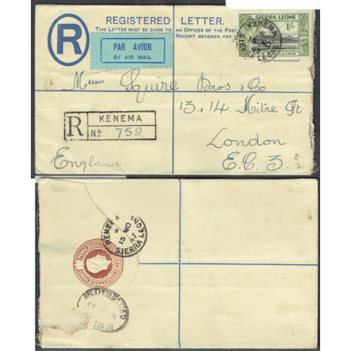 1950s original registered correspondence from different towns in Sierra Leone mainly to Shoe Manufacturers in Scotland, mostly on QEII 4d orange-brown registered envelopes, mostly uprated with QEII defins on obverse, some uprated with GVI defins, towns include MATTAU, MUNGHERI, HANGHA, SULIMA, ROTIFUNK, NJALA, KASSERI, LUNGI AIRPORT, HUIOU TOWN, BRADFORD, SEGBWEMA, PORT LOKO, KOIDU TOWN, GBANGBATOKE, FREETOWN BO TPO, SEMBEHUN, MAKENI TPO, then 6d orange-brown incl KAMAKWIE, GBINTI, PANGUMA, KENEMA, etc, very mixed (26).
