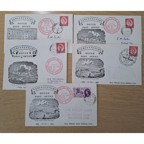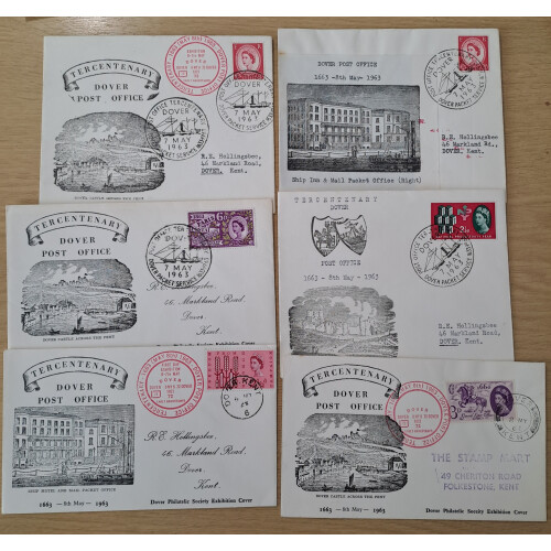 1963 7-8th May six different FDC tied DOVER PACKET SERVICE special cancels or tied normal DOVER cds with red cachet alongside for DOVER POST OFFICE TERCENTENARY 8 MAY, odd fault, typed or written addr. (6).
