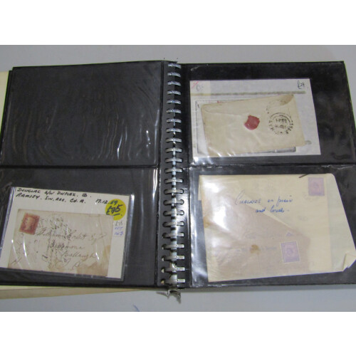Group of revenues on duplicated sheets cancelled to order, postal history from early to modern on leaves with a variety of postmarks on P/S cards for EDVII with 037 duplexes, Douglas 407 duplex, PEEL, LAXEY, 1850 E.L with DOUGLAS dated arc in blue on reverse (Code 7), Port St Mary cds, Port Erin, 1852 RAMSEY dated arc, Crosby, 1845 IOM arc on 1d pink P/S env, CASTLETOWN small piece with double line h/s, 1882 part env redirected in IOM, Calf of Man sheets and proofs etc. intr lot. Mixed condition.