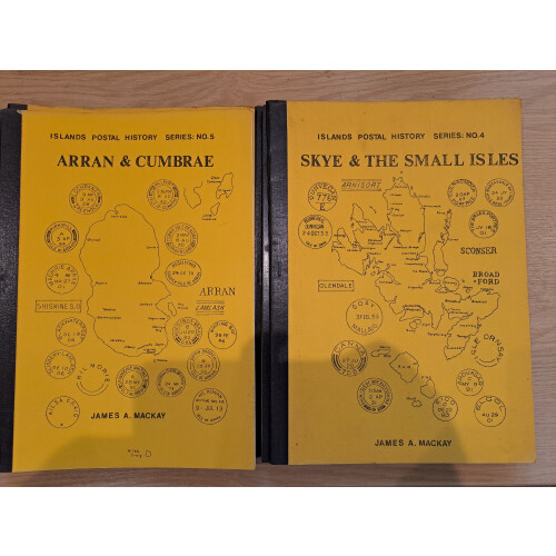 POSTMARKS by James A Mackay: A collection of fifteen A4 bound books covering a wide range of GB postmarks from prestamp to modern including Scottish Numeral Postmarks, Sub office rubber datestamps of England & Wales, Registered Mail of British Isles, Parcel Post, Harris & St Kilda, The Uists & Barra, Lewis, Skye & The Small Islands, Arran & Cumbrae, Mull Iona, Coll & Tiree, Islay, Jura & the other Argyll, Bute, Orkney & Stroma, Shetland, mostly in good condition.