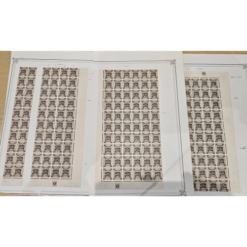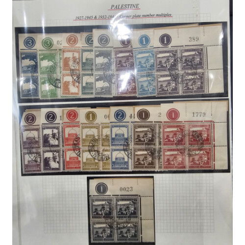 1927-1944 Pictorial issues in top right plate and sheet number corner marginal blocks of four fine used central PHILATELIC EXHIBITION / TEL AVIV / 8 AP 1945 cancels. Scarce in such an attractive format, interesting stamp exhibition cancels. SG 90/1, 93/4, 97, 100, 102, 103, 104-111.